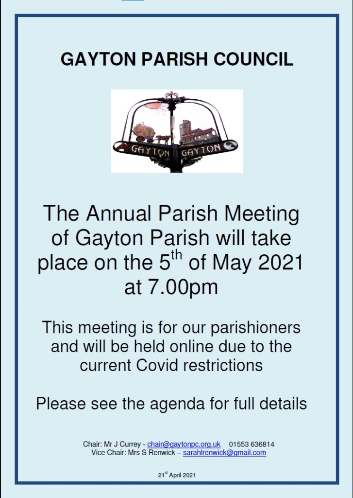 Annual Parish Meeting Gayton Annual Parish Meeting 2021 Agenda Share this:Tweet Related Uncategorized