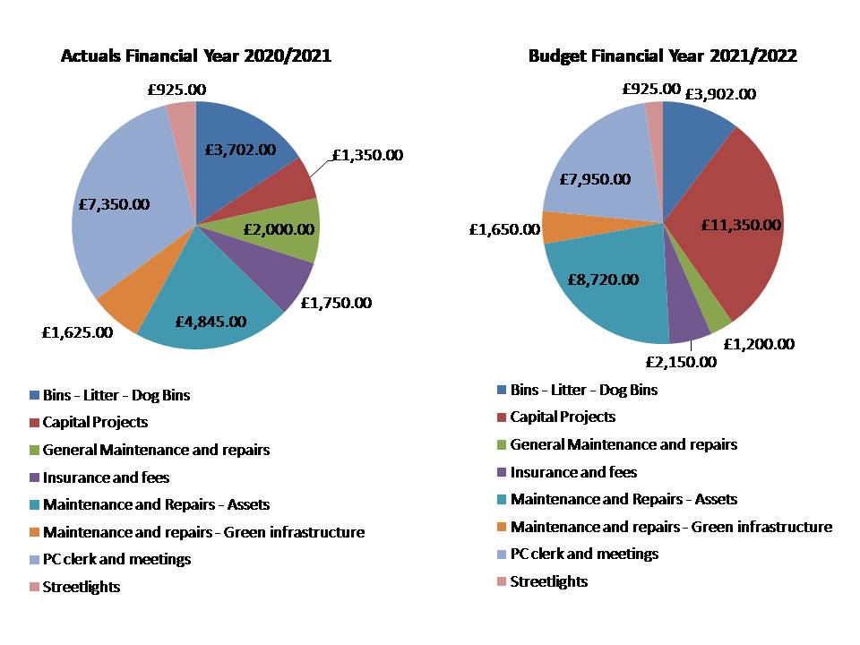 The PC believes that the relatively small amount of money it raises through the precept and spends on the parish has a large and noticeable impact on residents. The PC provides and/or looks after many village assets such as playgrounds, litter, streetlights, speed warnings, defibrillators, bus shelter, notice boards, public green areas, and footpaths and most of the precept is spent every year on regular expenses.